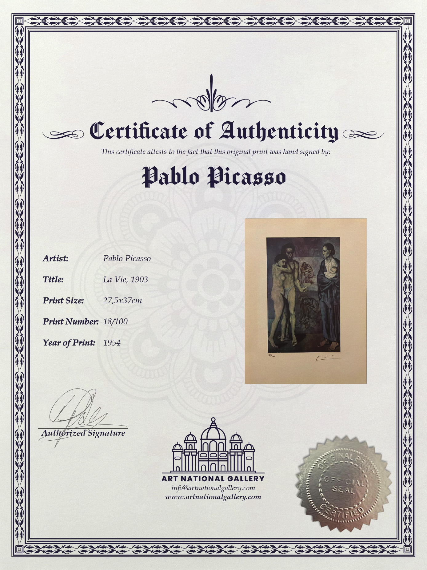 La Vie (1903) is a profound and enigmatic painting from Picasso’s Blue Period, rich with symbolic and emotional depth. The composition features two central figures—a young man and woman—engaged in a tense, introspective interaction, while a mysterious mother-and-child figure looms nearby.